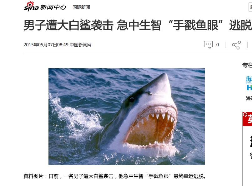攻击鲨鱼的眼睛、鼻子或是鳃,它们的眼睛尤其敏感,这似乎能帮助鲨鱼认识到它所面对的并不是普通的猎物,上面第二则截图新闻里的主人公就是用的这招死里逃生的。