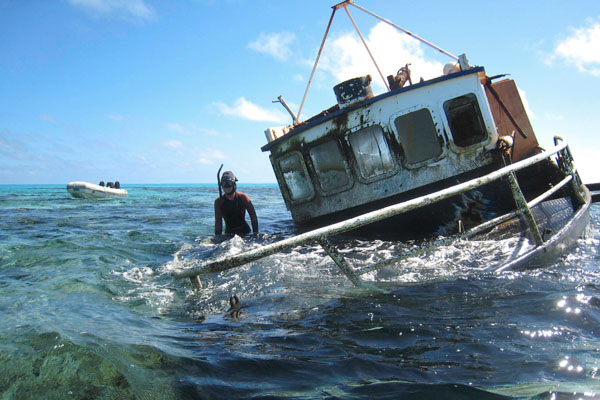 穿过沉船开口还是从沉船里游过?同样,顺着浪到边缘处,退浪时hold住,然后等到浪间歇时游过,或者从沉船开口处离开,而这个地方也是涌最强的。小心靠近。最好在沉船开口处放一个短梯。