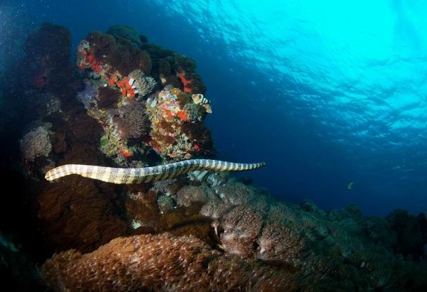 本来蛇是生长在陆上的爬虫类动物,怎么演化成以大海为秀场则有待专家解释,只知为了游泳方便尾部演化成扁平状以便于摇摆前进,呼吸构造也特别强化到可以一次换气在水里待2个小时,甚至皮肤也可分担5%的呼吸,从水中滤取空气。