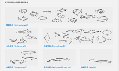 如果完全不知道鱼类名称、种类,可以从首页提供的鱼纲形状开始逐层筛选。仅需记住鱼类的主要外观特征即可检索到它相应的信息。