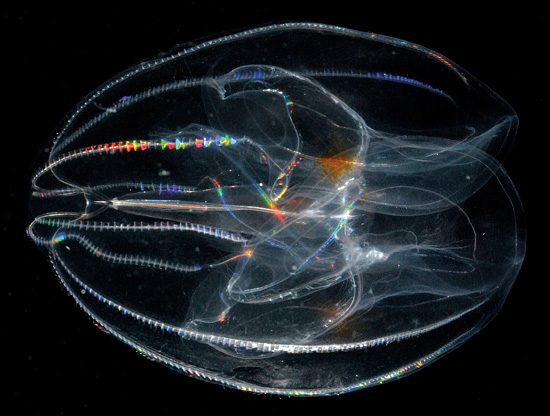 栉水母门曾经与刺胞动物门统称腔肠动物,但是目前已经分开。栉水母与水母外形相似,都是透明的,而且多是球型或吊钟型,依靠拍打身体周围的细小栉带在水中游动。当光线照射这些快速运动的栉带,会衍射出彩虹般的颜色。大部分栉水母还具有生物荧光,能自己产生光亮。另外,它们都是肉食动物,许多种栉水母会食用鱼类的幼苗,甚至因此严重影响近海的鱼类数量——包括图中这种5cm长的兜水母目Bolinopsis属动物。