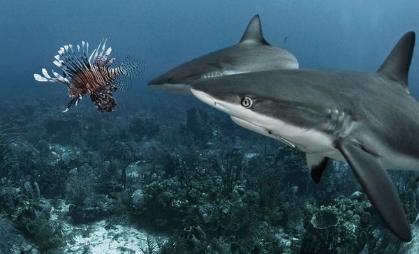 洪都拉斯坦岛海洋公园中的两只鲨鱼似乎正在思考要不要享用这顿狮子鱼大餐。洪都拉斯一些对鲨鱼习性十分了解的本地潜水高手决定利用鲨鱼来克制这些入侵的狮子鱼