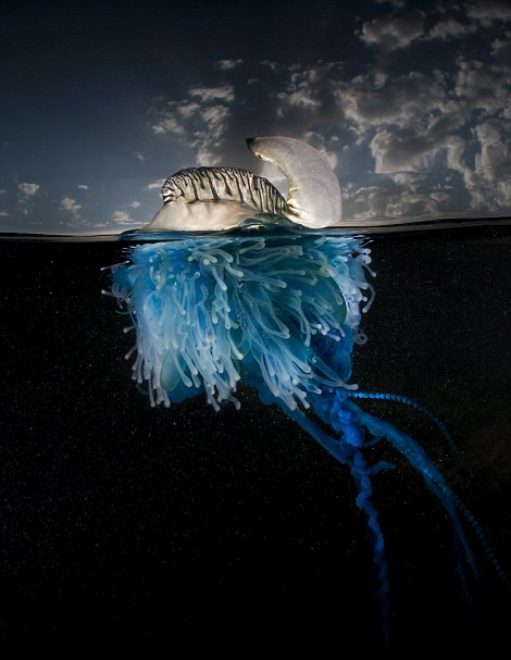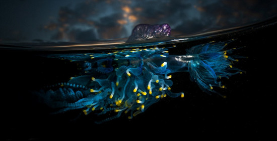 史密斯在澳大利亚新南威尔士州的Bass Point Cove拍下了这些蓝瓶僧帽水母的照片,他被它们颜色瑰丽的外表深深吸引,在史密斯的镜头下,水母的触角在夜色下的海水中发出绚丽的光芒,非常迷人,赋予其仿佛外星生物般神秘的色彩。