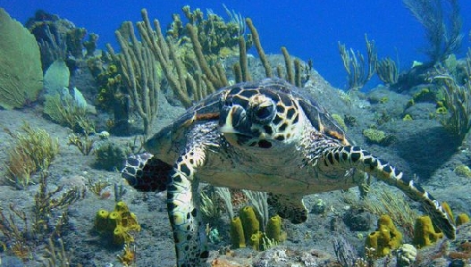 玳瑁龟。玳瑁龟海龟经常到全世界的热带海岸线,那里有便捷的筑巢海滩和在礁石上它们最爱的食物。每年,一只成年龟吃1,200磅(500公斤)重的海绵动物。