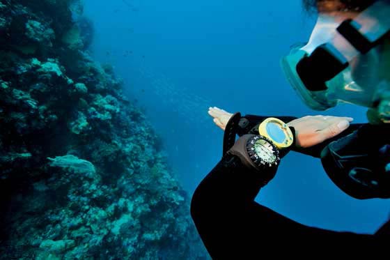 再者,当你还在船上或海滩上时,使用你的水下指北针策划你外出和返回的水下指北针航向,并将之记录,也请记住太阳的位置。