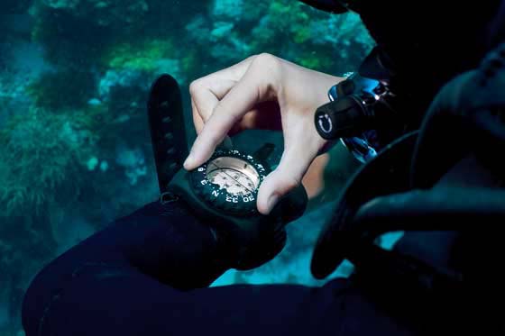 学习如何使用水下指北针,并添购一个到你的潜水装备中。要信水下指北针。当遇上你的水下指北针好像与你的记忆、本能或常识不符的时候,要相信你的水下指北针。它的正确性要比你高多了!