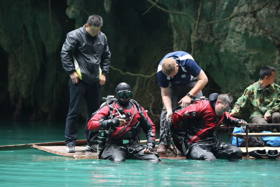 广西武鸣,潜水员选择可靠位置开始设置引导绳。