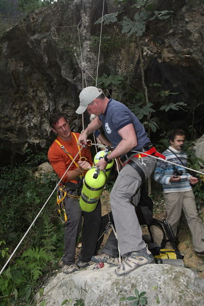 GUE团队在用绳索将潜水器材吊送到150米天窗下的入水点。