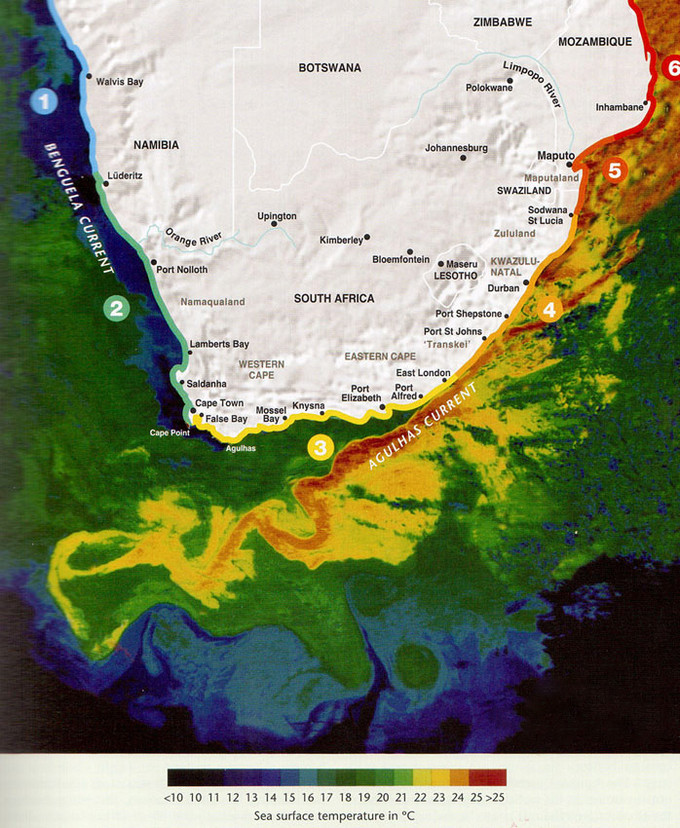 厄加勒斯角是非洲大陆的最南端,被国际海道测量组织定义为印度洋和大西洋的分界点。每年5月到7月间,总数可以数十亿计南非拟沙丁鱼就从厄加勒斯浅滩出发,沿着南非东岸向北迁徙,目的地是德班附近的北部海域,路线长度超过1000公里。