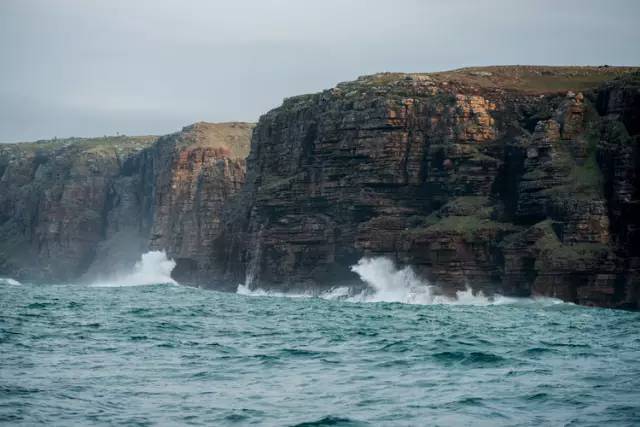 Waterfall bluff瀑布崖,在圣约翰港东北面50km的一处断崖,因为海底地形呈坡状,海豚群容易将沙丁鱼赶上浅海围猎,所以这里是BBC自然大事件、 国家地理等生态大片拍摄沙丁鱼最精彩镜头的拍摄地。