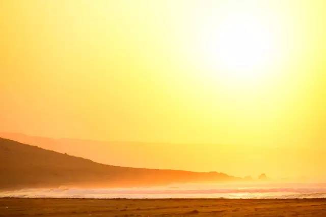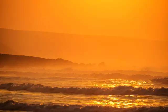 随着太阳渐高,伴着海浪粗暴拍打在礁石上扬起的水气,整个沙滩金黄霞粉一片,让人心旷神怡的感觉。