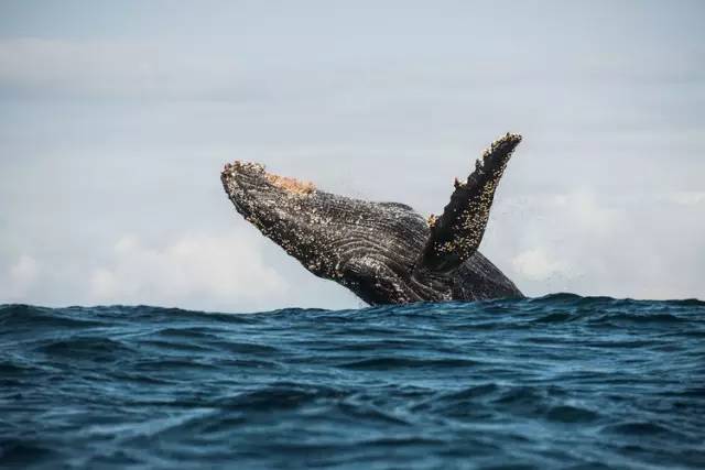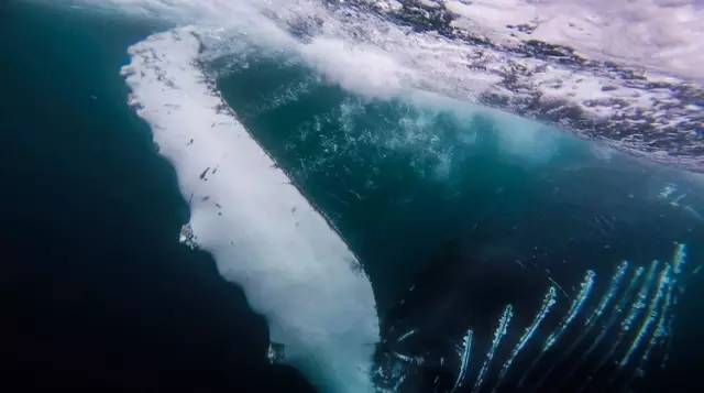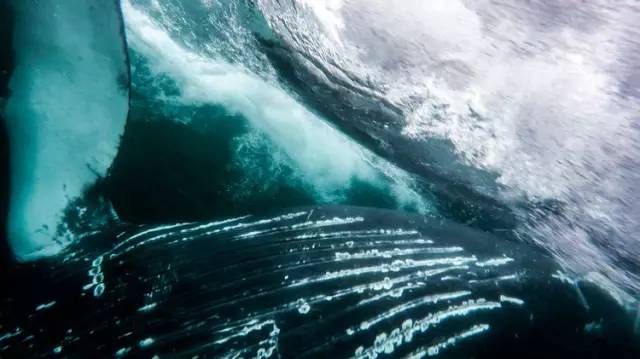 第一个是垂直上升,大翅鲸前缘具不规则的瘤状突起,突然从海底破水而出,高高上跃,然后身体优雅的向后弯曲,然后砸落水面时,溅起巨浪。