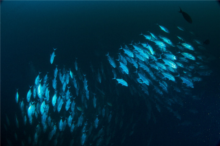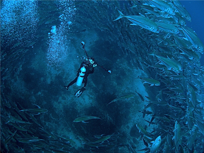 这里有一大群Jack Fish就生活在此,探访这个潜点能看到杰克风暴的概率是100%,没错,Vincent就是如此自信。如果有幸能和Vincent一起去这个潜点的话,他会用他的水下推进器带着你追随猎捕的大鱼在移动的风暴里穿行,成千上万的Jack Fish飞速迎面冲过转瞬从眼帘倒退,换个角度再次俯冲……零距离感受自然界优胜劣汰的震撼一幕。那一瞬间,嫣然觉得自己已经是海洋里一条合不上眼睛的鱼儿,任何有关这种潜水体验的想象都会变得苍白无力!