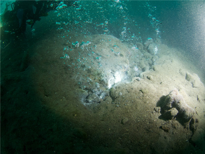 伴随着淡淡的硫磺味,下潜几米就能看到一串串不断上窜的气泡,随着水温的缓慢上升很快就下潜到遍布褐色细沙和泉眼的海底。如果你觉得来这里只能泡一次穿着湿衣背着气瓶这么不寻常的温泉仅此而已,那你就错过了最有意思的潜水体验。贴心会玩的潜导已经早早地带上“道具”来带你玩转韦岛温泉。先将鸡蛋放在泉眼处煮上吧,再去玩点别的。