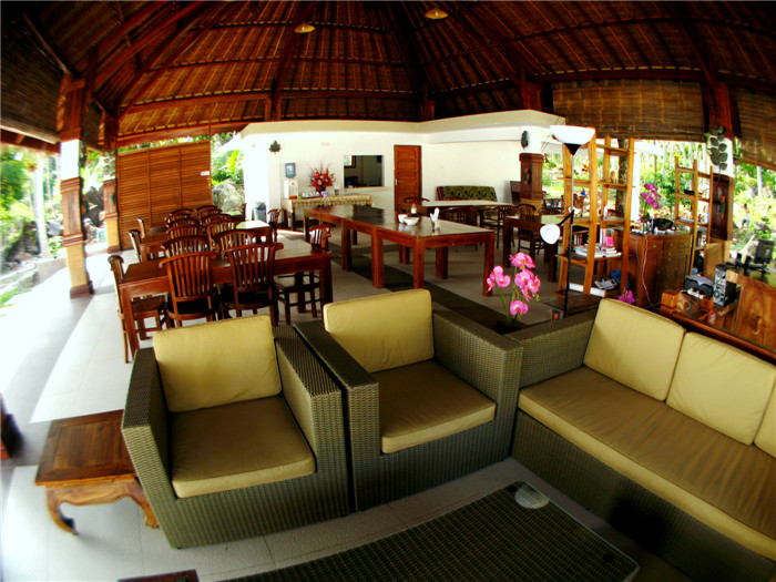 充满南洋传统建筑风格的大厅,屋顶用亚答(Attap)搭建,隔热通风,是度假村客人最喜欢呆的地方。即使不潜水,浮潜、钓鱼之余在这里看着欢呼鹊跃的潜水员归来,再和他们围在一起看看水下照片、视频,听听他们讲一整天当天潜水那些喜闻乐见的东西也是件有趣极了的事情。