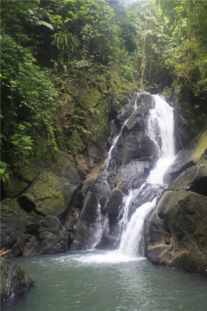 沿着幽静的林间小道,开始一段刺激的丛林探索,趟过小溪、攀过巨石,站在山崖上就能看到一段白缎般的瀑布从高山上落入水潭。这里能看到的瀑布只是它的下半段,如果想要看到完整的全貌只能越过更高的一座无径山峰才能看到了。