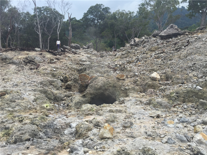 有一段行程,郁郁葱葱的耸天丛林中突然出现一片古木断枝残干,再往前就是一片白芒芒的火山灰,高温岩浆仍在冒着气泡翻腾,海拔617米的气孔火山就在脚下。这个地方也是地热能源储量地,储备的能源估计达到50兆瓦的潜力。