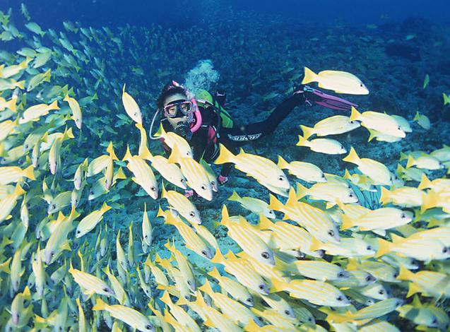 海洋翻车鱼(Mola Mola),每年聚集在这些岛屿周围。虽然一整年或许偶尔看到海洋翻车鱼,最佳时刻还是在七到十月之间。 鱼类小知识:“人类已经发现,Mola mola会跳出水面跳跃10英尺,用力击打水面,以摆脱身上的寄生虫带来的困扰。”