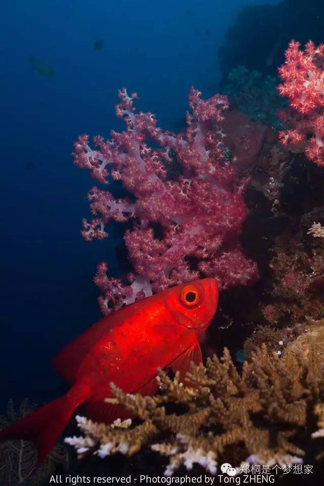 硬珊瑚上面的鱼群,这种红色小鱼很怕闪光灯