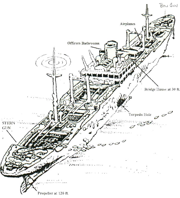 就在美军展开“冰雹行动”前夕,富士川丸号到达楚克,船上装载的三十架“JILL”B6N2轰炸机,被运送到ETEN机场。但是由于这些战机是被拆开运输的,所以在他们还没来得及参加楚克防御战的时候,就被摧毁于地面上了。而富士川丸号则毁于美军空投的一枚鱼雷,船身垂直沉没。至今货舱中还留有零式战斗机。