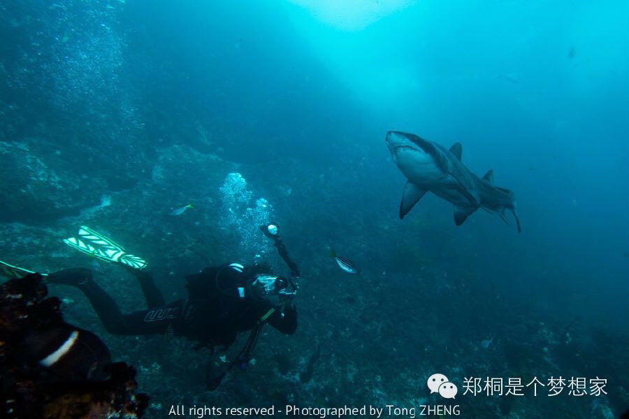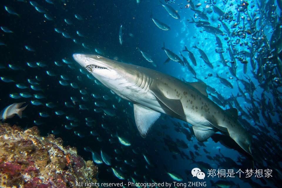 对于潜水员来说,Inner Rock虽然有无敌的能见度,但是底下真的除了石头东西不多,我们这次也是比较探索性质,不过不是很推荐。主要如果Looking Glass不能潜的话,North Rock可以作为一个不错的代替潜点。North Rock也经常可以看见大群的灰护士鲨 (Grey Nurse Shark),中国也叫做 沙地虎鲨,澳大利亚虎鲨。这种鲨鱼最著名的特征是侧面的斑点,以及龅牙。看起来很凶残,其实非常打酱油,完全对人没攻击型。但是还是那句话,Show Your Respect to Animals。所谓人不犯我,我不犯人。兔子急了还咬人,别说鲨鱼了。一般伴随着鲨鱼存在的就是这种大群的小黄鱼群,非常夸张的漫天都是,看到后简直不敢相信自己的眼睛。这次的照片在底下,虽然没有第一次去的时候的Looking Glass好,但是也勉强能看。
