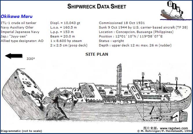 这艘二战日本海军运油船长 168 米,10045 吨,无论是长度,宽度,还是容积,Okikawa Maru是Coron湾地区沉船中最大的一条。这种船以从南海向日本运油为主要目的,同时也可为舰队提供伴随加油。由播磨造船所设计,共19艘,科隆湾下趟着的只是其中的一艘。正坐在菲律宾科隆湾的巴拉望岛,Conception以南的2英里处海底,几乎是水平地躺着,有轻微的向左侧倾斜,指向罗盘方位330度,船头与船身断裂,船首的1/4部分受到巨大冲击并且翻折起来。最浅处10米,尾部折断埋在26米(86英尺)水深。主甲板16米(53英尺)水深。