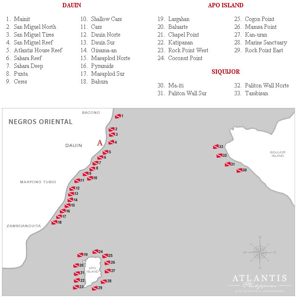 位于菲律宾宿雾岛南边的Dauin是世界著名潜水观光地区,交通方便,海洋生态丰富,软珊瑚种类繁多,充满各式海洋生物和热带鱼。Atlantis潜水渡假中心是杜马盖地最棒的潜点渡假村之一。