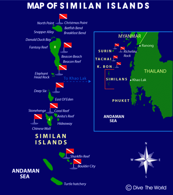 斯米兰潜水多以船宿潜旅为主,机动性强,可以充分体会每一潜点之特色,斯米兰海底景观是以巨大的花岗岩与丰富的各色珊瑚组成,与其它潜点有完全不同感受。主要潜点有:Elephant Head Rock 象头岩 海底山丘连绵,有如蜀山。Chrismas Point 圣诞角, Fantasy Reef 仙境礁,Eagle Ray Rock 的鳐鱼,Eden Garden 是斯米兰唯一的Drop off,Great Wall巨石墙气势宏伟,Richelieu Rock可能是世界上观看鲸鲨最佳地点,从十月到五月几乎都可以看到鲸鲨出没。还有著名的豹纹鲨 Leopard Shark,似鳐又似鲨的吉他鲨Guitar Shark等,令人惊喜难忘。