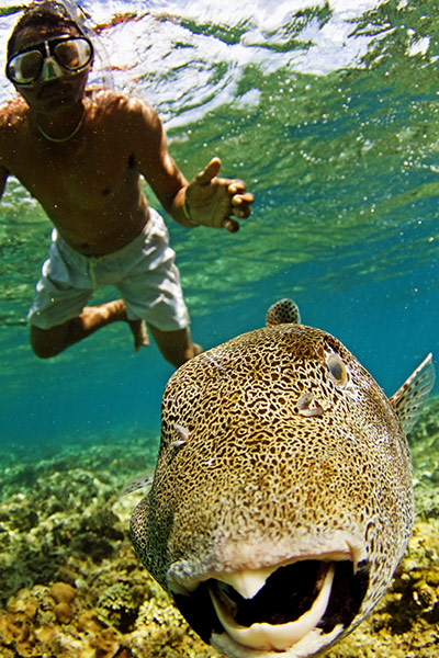 作为常年与海洋打交道的海上牧民,住在印尼苏拉威西岛(Sulawesi)的伊姆兰(Imran)潜水技术非常高超。为了避免被咬到,伊姆兰将自己的拇指和食指放在这只箱鲀的眼窝上,一旦鱼眼被蒙上,伊姆兰会带着它游到自己的船边。