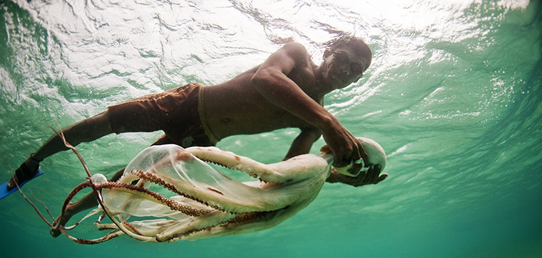 加特敏(Jatmin)是一位捕章鱼的好手,他带着一只刚捕获的章鱼正游回自己的船上。