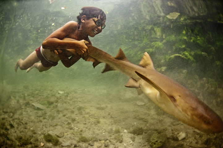 虽然出生在船上的孩子越来越少了,但海洋依然是他们最好的游乐园,照片中的恩纳尔(Enal)正在和自己的宠物鲨Wangi Wangi玩得不亦乐乎。