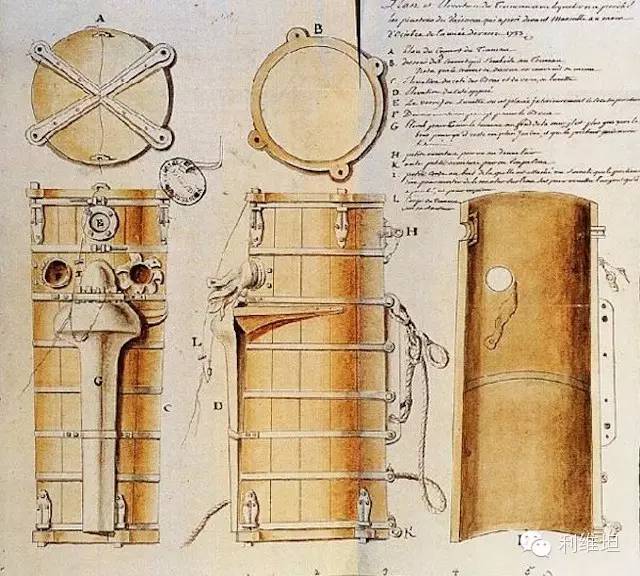 此潜水器是一个由密封的橡木桶制作而成的,用来打捞海底沉船中有价值的残留物。当时,另一位英国人Andrew Becker也发明了一个相差无几的潜水器,同样装有两条进气和出气的管子。