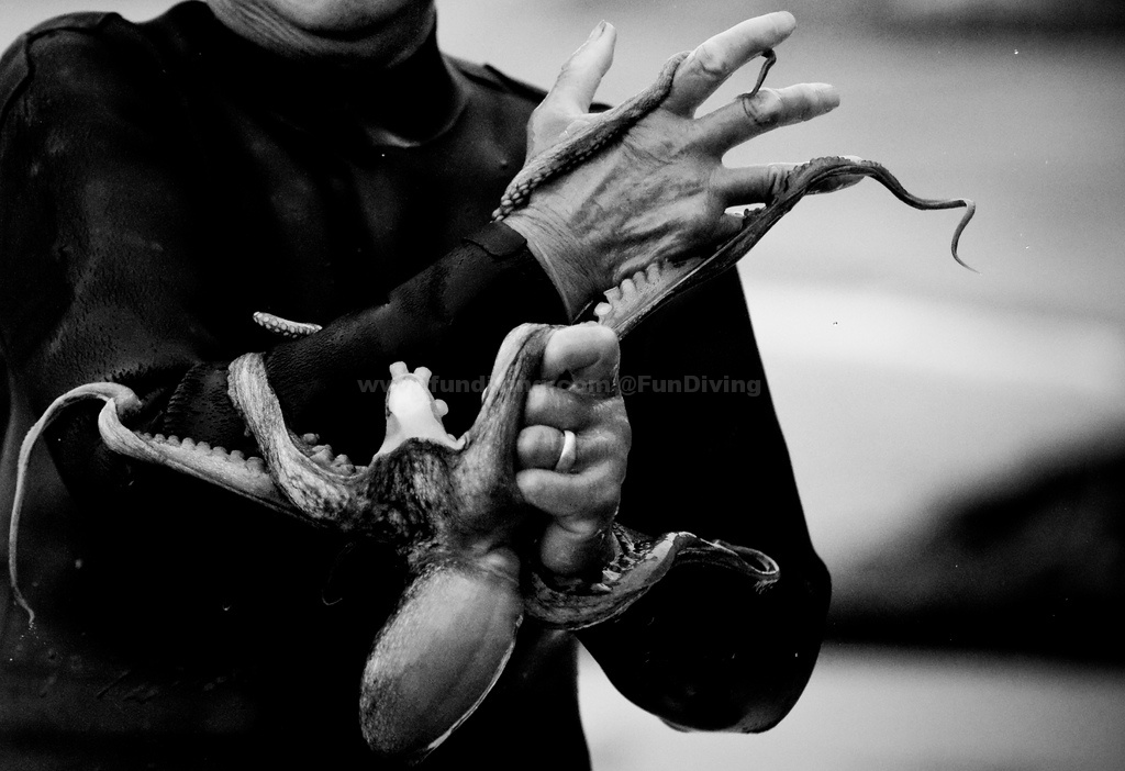 章鱼、海胆、海蜇都是海女的猎物,但她们的主要目标是生长在低潮线以下岩石上的一种软体动物 ——鲍鱼。仔细看,你会发现海女手腕上都拴着一个铁铲,在海底就要靠它把礁石上的猎物撬下来。鲍鱼身体外包着很厚的石灰质贝壳,如果不小心铁铲被鲍鱼的贝壳夹住,海女的处境就非常危险,每年都有因此丧生的姐妹。