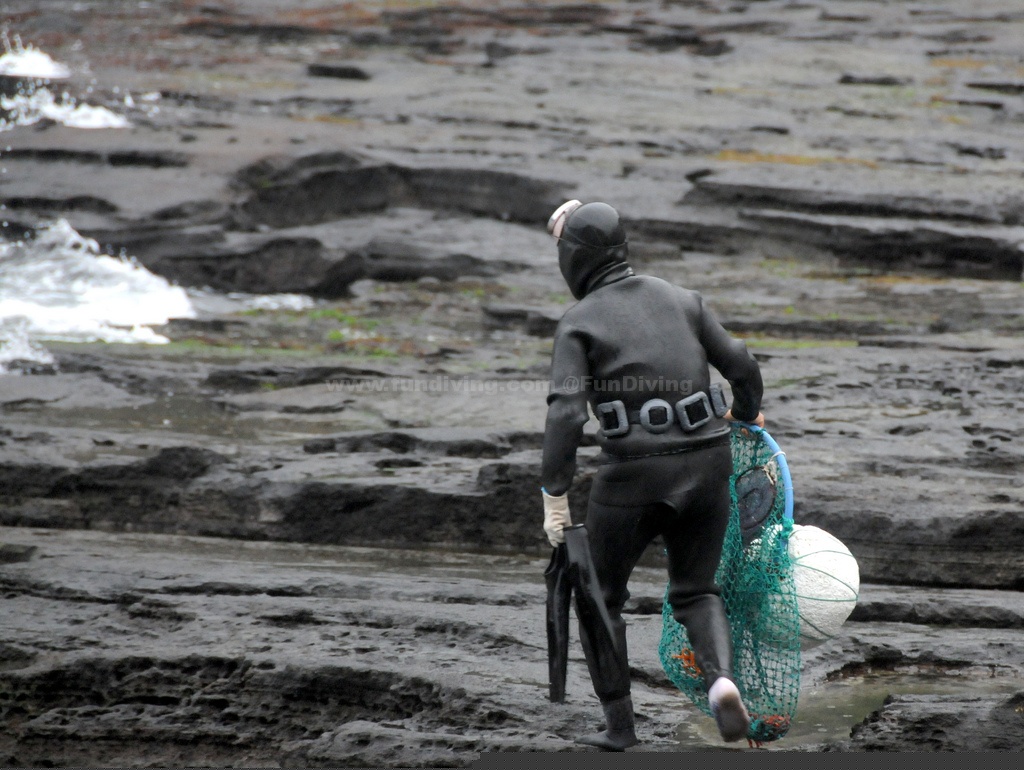 她们只在距岸近的浅海中捕捞。海女们则不得不潜入深海,她们面戴潜水镜、腰系救生绳,潜入较深的海中,用特制的尖刀,撬下海底石头上的珠贝,然后带回海面。