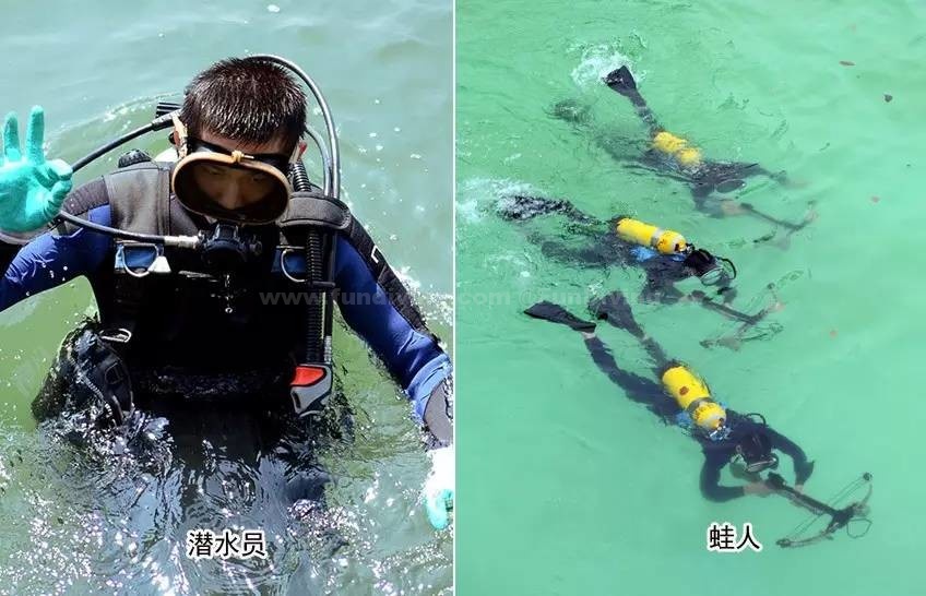 “蛙人”也必须会潜水,但他们只需要掌握潜水的基本技能,他们执行任务时往往要携带武器和特战装备。相比之下,潜水员则需要掌握更为复杂的专业潜水技能,并能够执行各种水深的复杂搜索、搜救任务,潜水员的潜水装备更为多样和复杂,但一般不携带武器,不执行一线作战任务。