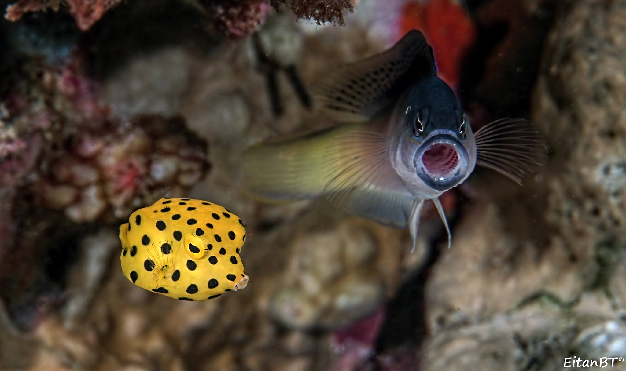 Yellow Boxfish (and his bodyguard.....) Red Sea - Eilat. Israel 09/2015 Sony A6000 16-50mm, 2X S&S YS-D1, f8, 1/250, ISO100 Photo by Eitan Ben Zvi