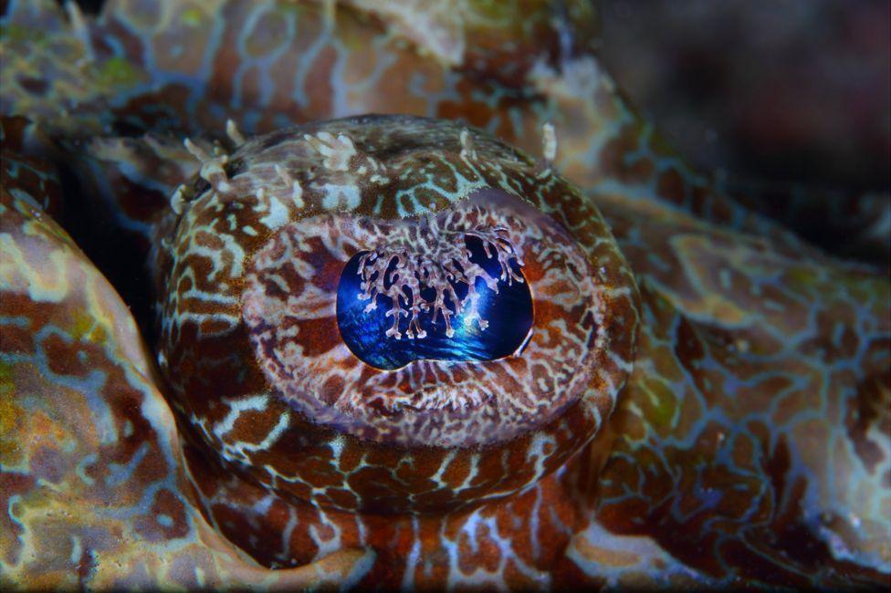 马来西亚的鳄鱼鱼(Crocodilefish)吸附在海床上,试图伪装自己。鳄鱼鱼因为其外形很像鳄鱼而得名,它看着可怕,其实很温顺。