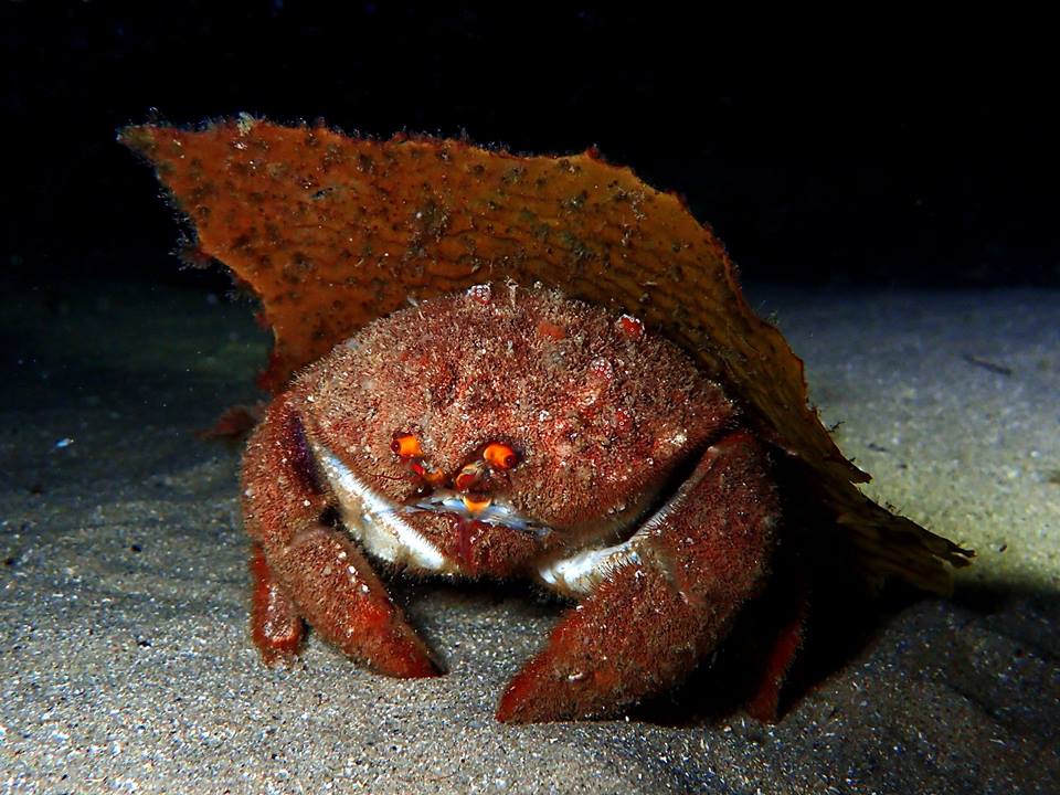 Sponge Crab with kelp used for camourflage Port Noarlunga, South Australia. Night dive - No editing/minor crop Olympus TG-4 with Ikelite housing: f/2.8, 1/60 sec, ISO-200 Intova 300 lumen focus light with ocular lens removed + Internal flash photo by Steve Jones