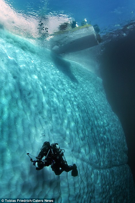 为了捕捉冰山的全貌,Friedrich要潜到水下30米左右的,并忍受冰冷刺骨的海水。