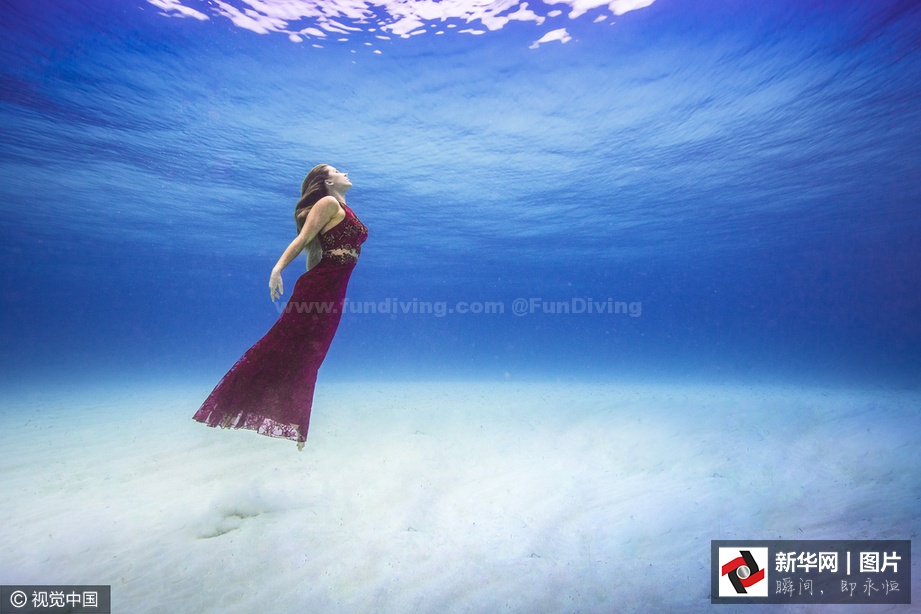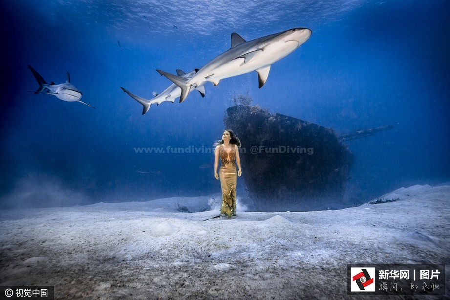 近日,一名拥有多年专业潜水经验的冒险者身着华丽的衣服在巴哈马群岛附近的海中拍摄了一组写真。她在拍摄这组图片时未戴任何呼吸工具,身边还不时有鲨鱼游来游去。此次拍摄活动在一个鲨鱼保护区进行,目的是为了警醒世人鲨鱼面临的灭绝危机。