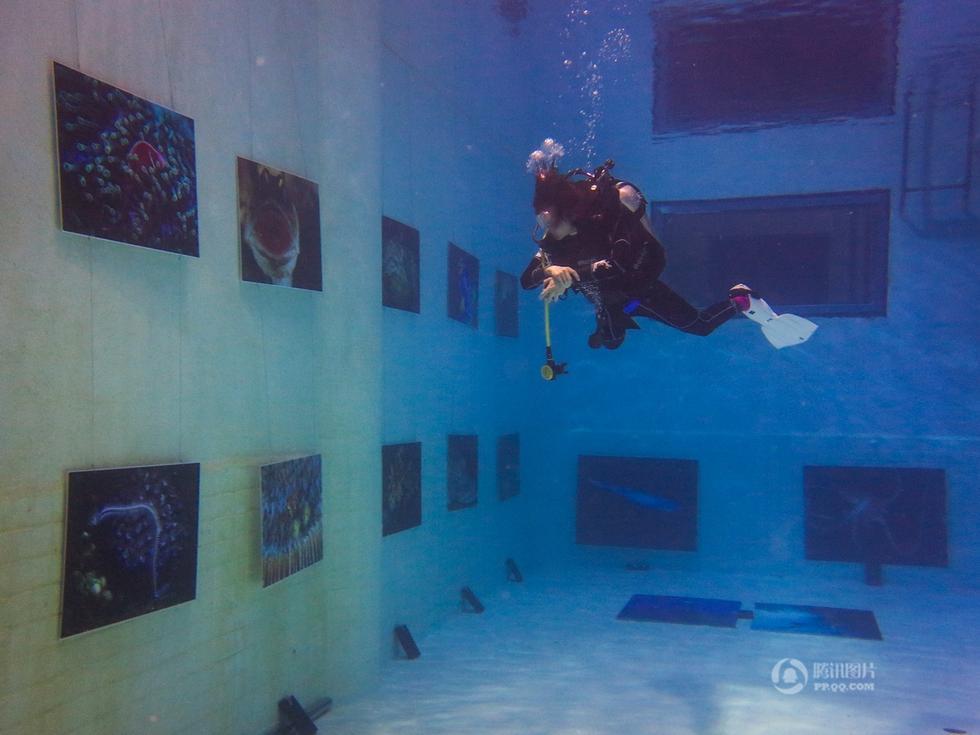 每一种选择都必须结合具体环境来考虑……如果摄影师能对整个展览过程有所创新,在必要的时候可以忽略传统展览的惯例,那么在一个很恶劣或不寻常的环境中举办展览可能会获得意想不到的回报。”总是习惯于地球重力影响,总是习惯于头上脚下的平衡感和空间感,人的眼睛只有在空气环境下才能有效地进行聚焦动作,此次展览打破了观看展览的惯性思维和操作方式,让观展者获得全新的体验和感觉。图为水下展厅。