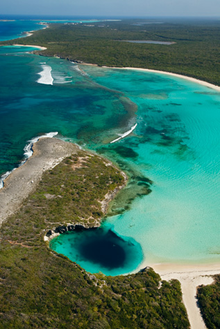 一名潜水员可在水面俯视下方的大巴哈马岛国家公园的卢卡约本洞穴的入口。这个国家公园成立于1970年,旨在保护地球上最长的内陆水下洞穴系统之一。