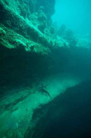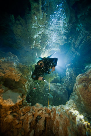 在大巴哈“垃圾坑”里,Kenny Broad蠕动着穿过狭窄的通道,引导绳可以让他安全的返回地面。尽管洋流把垃圾扫到这个洞穴的深处,岩壁生活着各种生命,包括亮红色的苔藓虫;光滑、灰色海绵;带刺的水螅,可以划伤裸露的皮肤。对于许多洞穴潜水员来说,跟Broad一样进入一个以前未探索过的通道,是很神圣的。