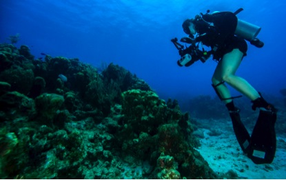 八,广角镜头是拍摄潜水员的利器,因为,即使在很近的距离内,你都可以拍到潜水员的全身照片。如果潜水员是照片中的唯一主体,请注意所占的角度不要超过100度,否则他或者她就会有严重的变形。
