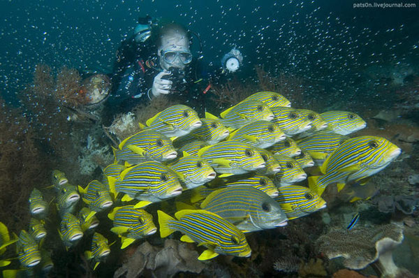 接近鱼儿需要一定的经验,除非你到那些经常有人喂鱼的地方潜水。记住,当你喂鱼的时候,你是在改变它们的自然习性。在不久的将来,即便这些鱼儿没有被你的早饭残渣弄得消化不良而送命,也将面临鱼枪的索命一击。