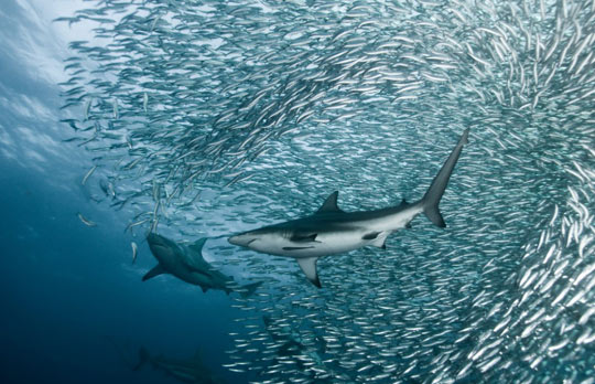 五,开放水域中的鲨鱼和鳗鳎是很机敏的动物。它们的背是深色的,肚子是白色的。绝不要使用TTL。根据环境光选择一合适的光圈和快门,将闪光灯的强度降低,然后去填充你的取景器就好了。