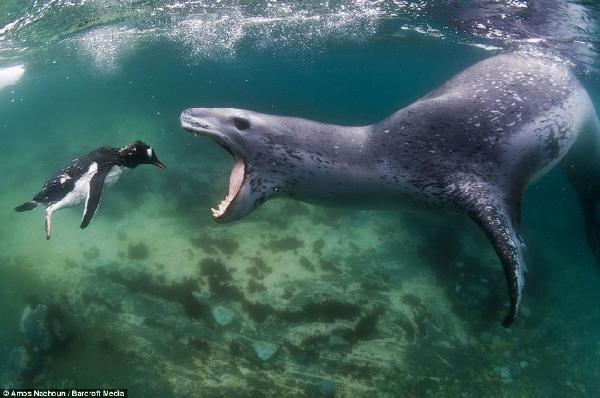面对死亡 企鹅遇见了它的天敌leopard seal,在南极Port Lockroy 附近。 幼小的企鹅在浅水中玩耍,但是危险悄悄降临。
