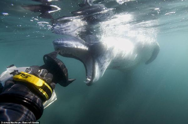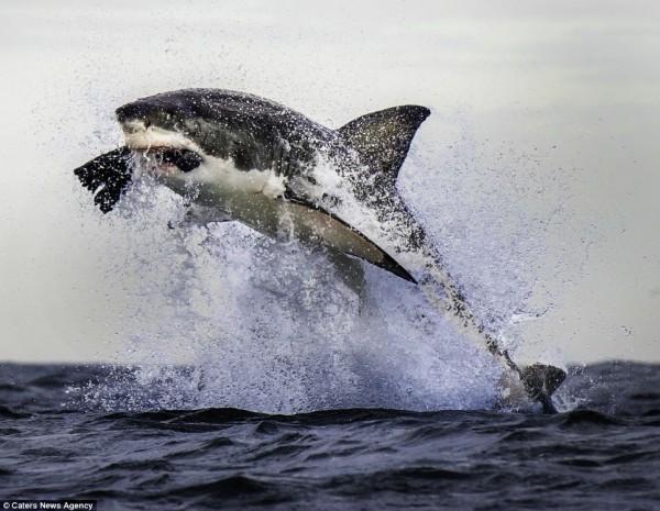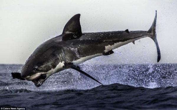 摄影师 Allen 的团队花了整整三天来用这只假海豹诱饵引诱鲨鱼出水捕食。最后,这只不明真相的大白鲨就这样落入了人类的圈套。
