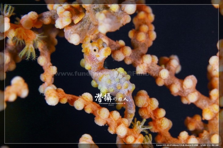 Kirby’sRock(我们暱称它做海参山5-30m/dropoff75m)这个潜点首先会带给你视觉上的震撼,就是整个海底山丘布满黄色的花海参(ColochirusRobustus,山丘约高20m全都密密麻麻布满着!),然后就是到29m位置排队睇黄色的豆丁海马(PygmySeahorse),这里有一株位于「山脚」的海扇网状珊瑚(Muricella),必定可以找到豆丁海马,因此每天都有潜客在排队等拍照。