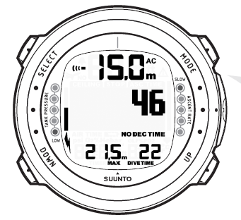 某些时候,不显示数字,而显示一个小横杠加下面是”NO DECTIME“,这表示在这个深度,你可以一直呆到没有气,都不需要减压。